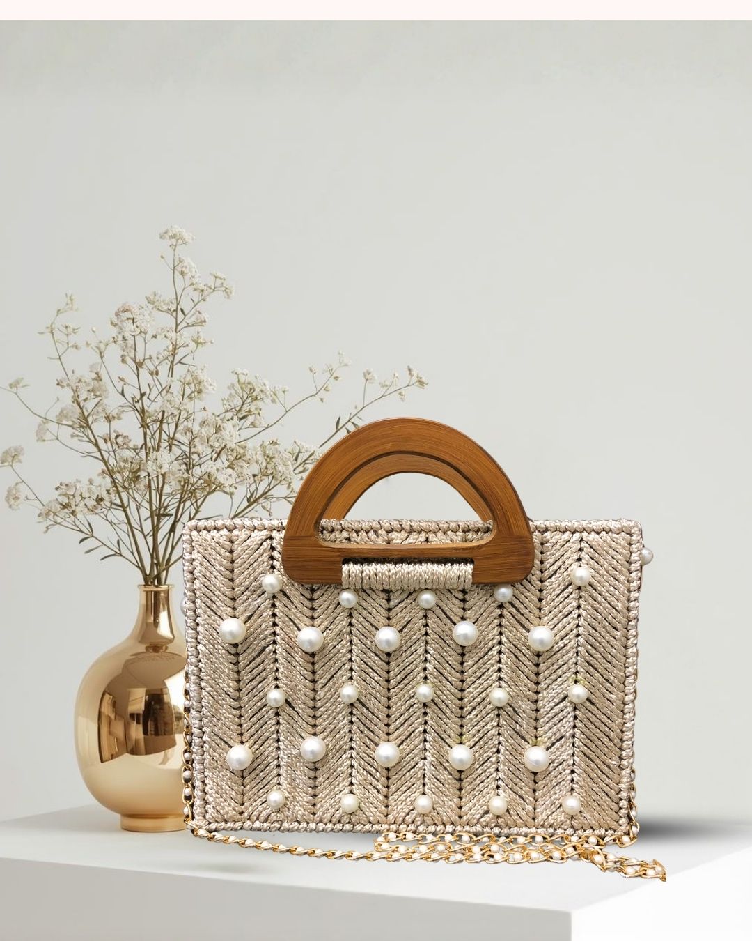 بیگ کے اوپر چھوٹے اور بڑے موتیوں کی دلکش ایمبلشمنٹ کی گئی ہے جو اسے ایک نفیس اور خوبصورت لک دیتی ہے۔ اندرونی حصہ نرم اور معیاری کپڑے سے تیار کیا گیا ہے تاکہ آپ کی اشیاء محفوظ اور ترتیب سے رہیں۔