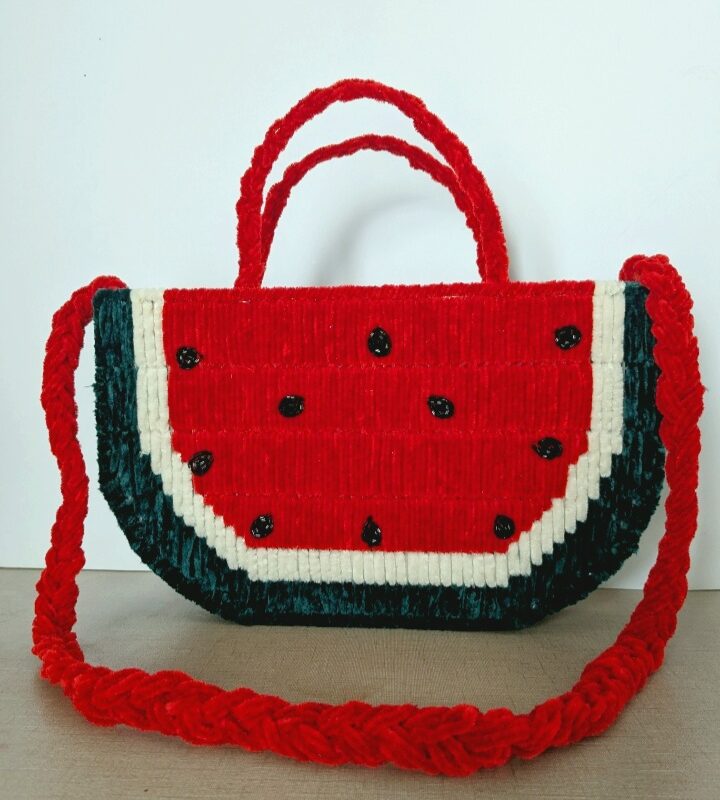 “This beautiful handbag is crafted from high-quality paper yarn and embellished with pearls and green stones arranged in a charming grapes design. The premium chain adds both style and durability, while the spacious interior makes it practical for everyday use. Its refined detailing and high-quality craftsmanship allow it to pair perfectly with all types of outfits—making it a unique and stylish accessory for any occasion.”