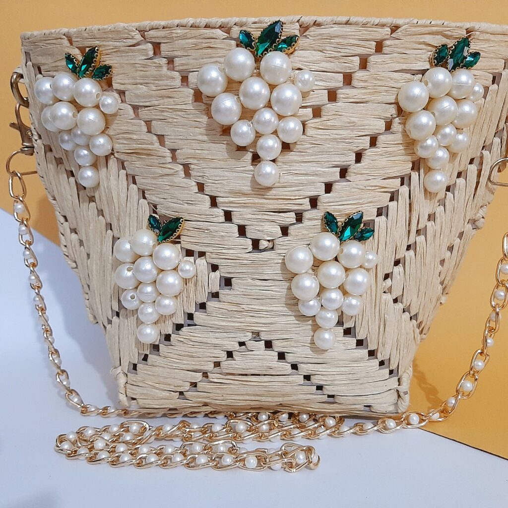 The handbag comes with a structured opening lid, adorned with a delicate decorative brooch that enhances its elegance and gives it a luxurious finish. A long, beautifully crafted strap allows it to be carried comfortably on the shoulder or styled as a hand bag, making it both versatile and stylish.