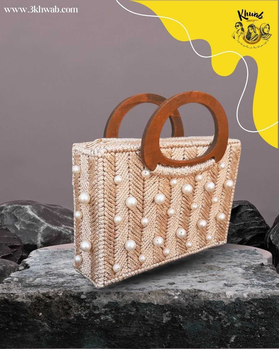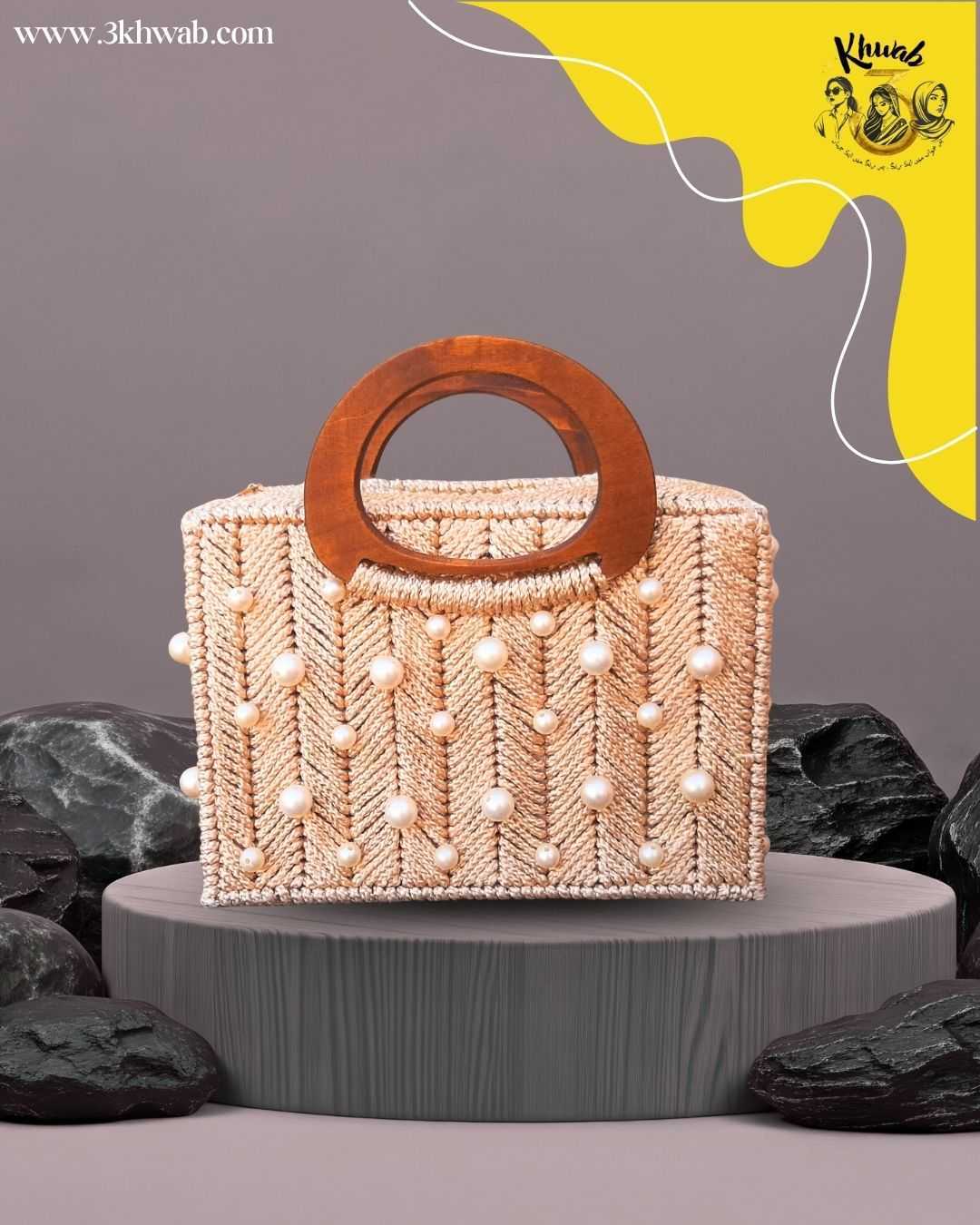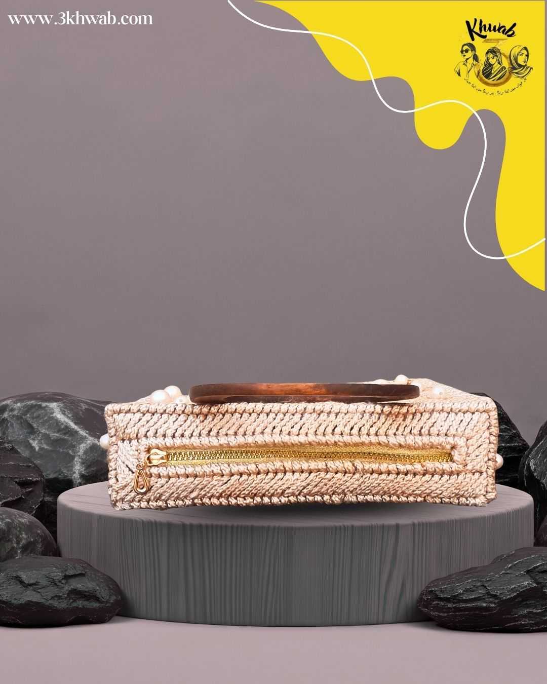 Rushk is a soft skinish powder-shade tote bag, delicately handcrafted with macramé threads and detailed with white PEARLS like morning dew. 💫