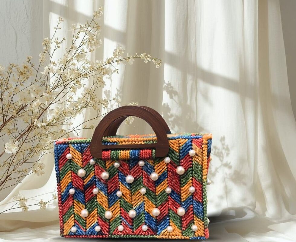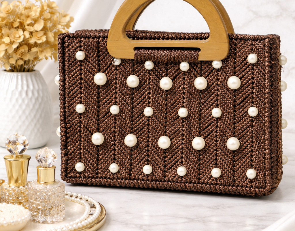 Beautifully detailed with a combination of big and small pearls, Rushk (Skin) offers a delicate contrast against its soft base. The wooden handles add a natural, classy touch while ensuring comfortable handling. Inside, the tote is finished with smooth silk lining, providing durability along with a premium feel.