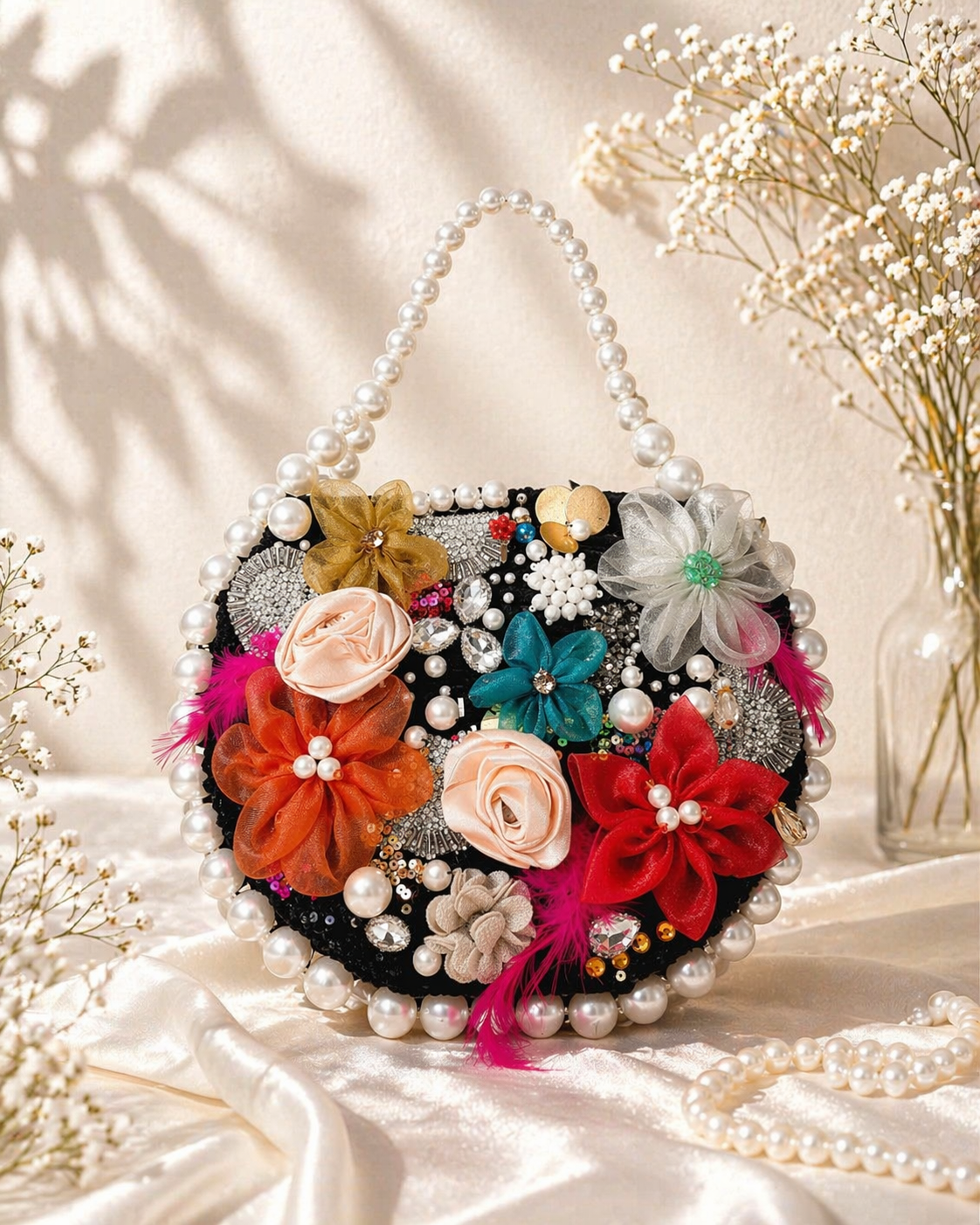 This round handcrafted handbag, inspired by underwater gems, features intricate fabric flowers, pearls, crystals, and shimmering details on a deep black base. A true statement piece, it combines artistry and elegance, perfect for special occasions and festive events.